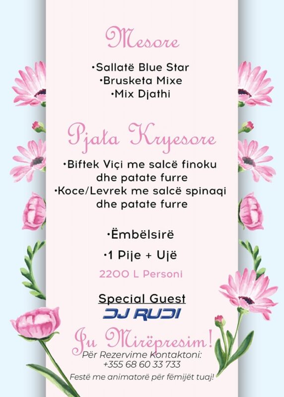 Organizimi do të jetë në drekë dhe në darkë e shoqëruar me Dj. (Dj. Rudi).